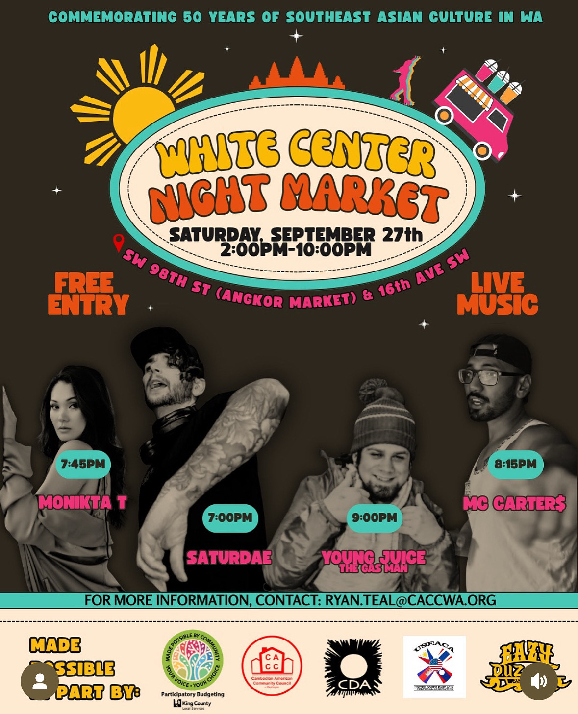 The event was seamless, vibrant, and full of life β from the performances to the coordination to the sense of unity in the crowd. Thank you to the entire CACCWA team, the Participatory Budget Program of King County, and all the partners and performers who made this possible β including the White Center Community Development Association, the United Southeast Asian Cultural Association, and the Eazy Duz It Car Club. The 50 years of Southeast Asian cultural celebration were honored beautifully.β